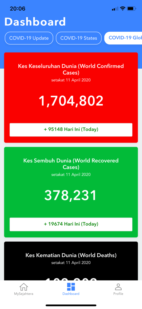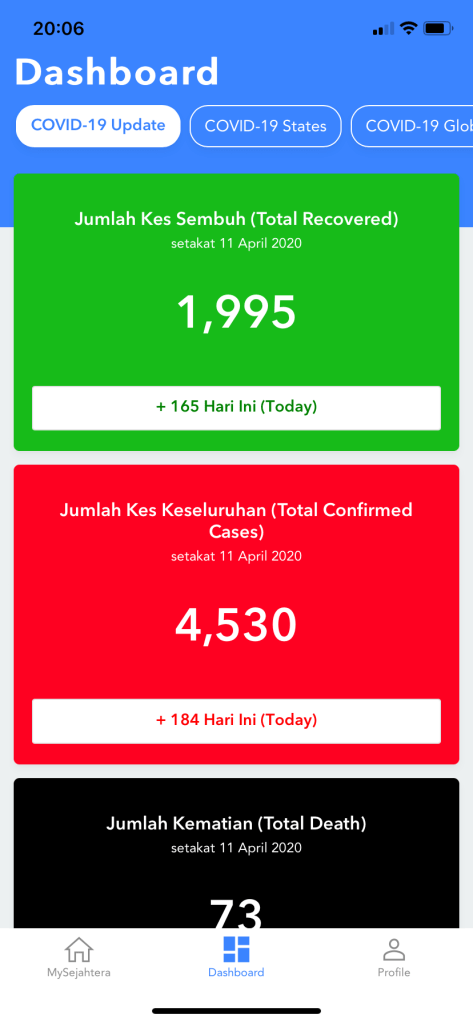 Upfront the app will tell you the latest information on the COVID-19 statistics. Basically a summary, in numbers, of what you usually get during the KMM (Health Ministry) 5PM update.