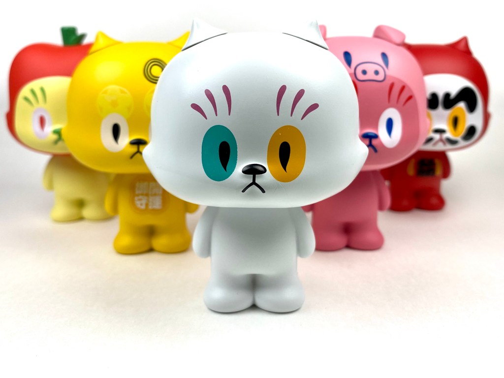 The five figures in the collection are OG White Yuurei Neko Sama, Daruma Neko Sama, Piggy Neko Sama, Ringo (apple in Japanese) Neko Sama, and Fortune Neko Sama.