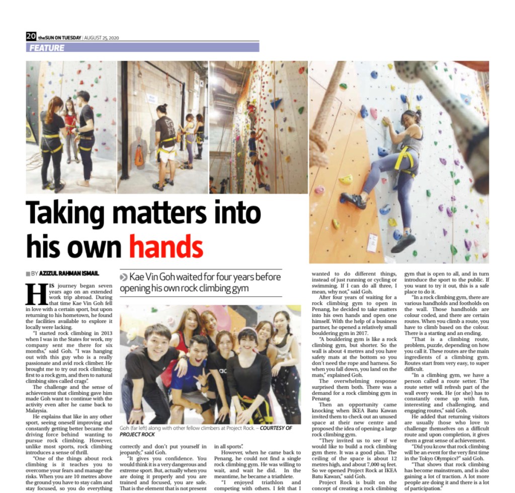 After falling in love with the sport of rock climbing abroad, Kae Vin Goh came back to his hometown only to find that there were no rock-climbing gyms. After years of waiting, he decided to open one himself.