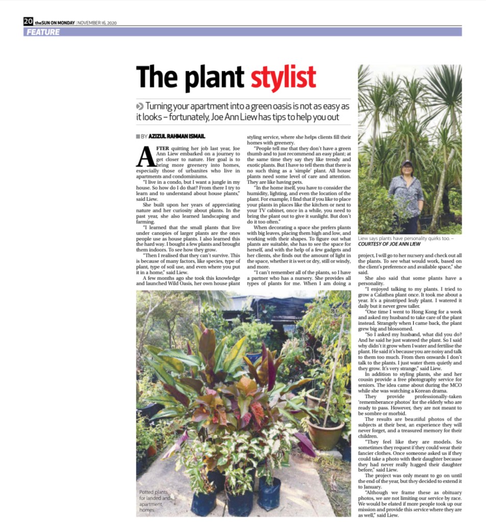 There are two parts to Joe Ann Liew’s story. One is about the nature-loving urbanite who wants to bring greenery into the home and became a plant stylist. The other is a photographer who takes remembrance photos of the elderly for their obituary.
