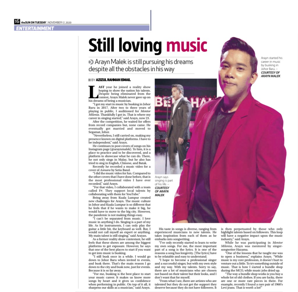 A simple search tells the story of how Arayn was once a reality show contestant. He left Johor for Kuala Lumpur in search for a place in the entertainment industry. Despite his talent, he didn’t win and despite the loss, he never gave up.