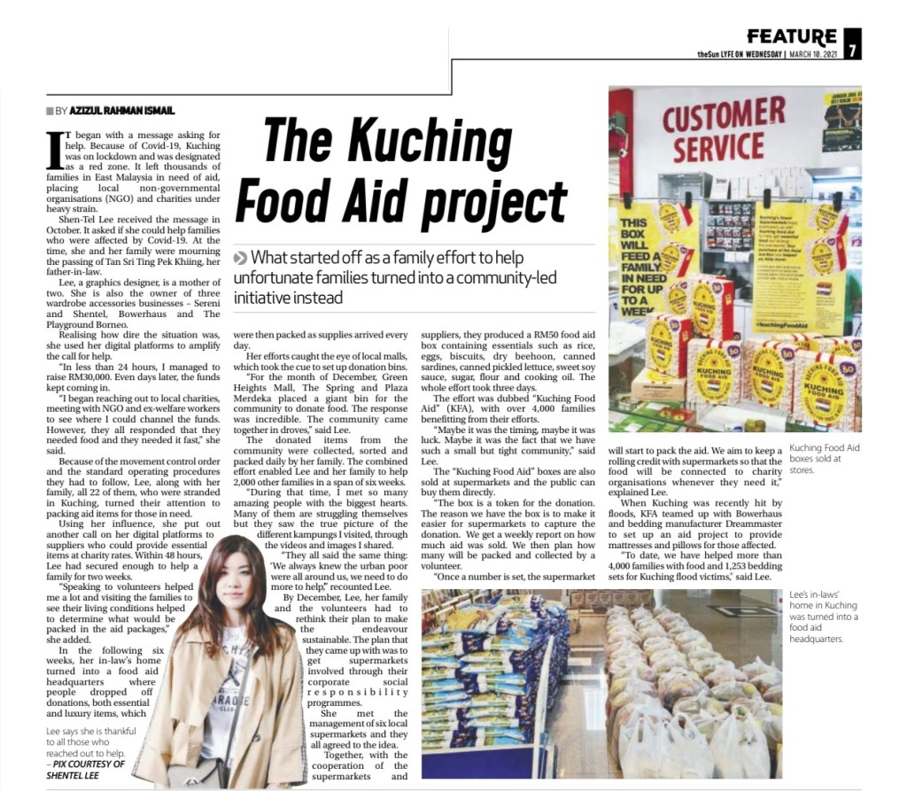 Using their collective resources and business know-how, Shantel Lee and her family build, started, and launched, The Kuching Food Aid. A self-sustaining charity powered by the community and local businesses that is still running and helping people to this day.