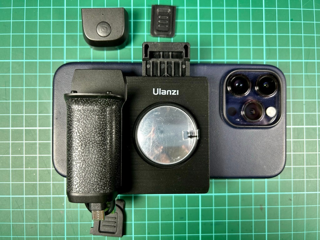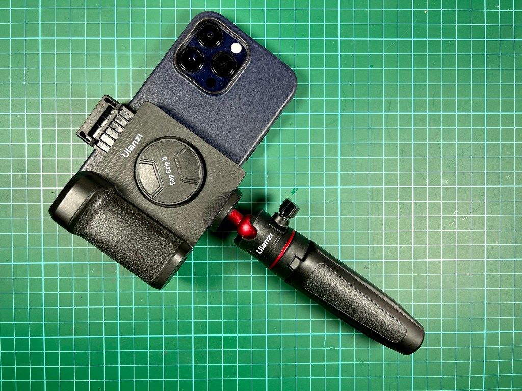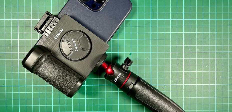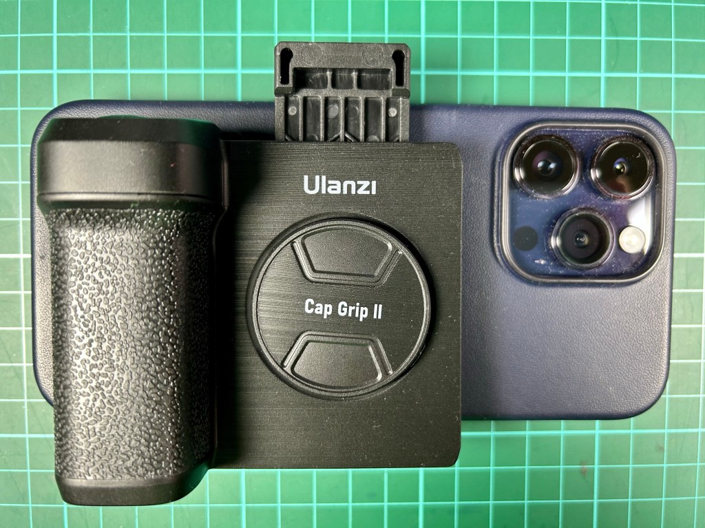 The Ulanzi Cap Grip II (CG01) attaches to a smartphone to add a shutter button and a camera grip. It makes the iPhone 14 Pro Max (with cover) work and feel like a dedicated camera.