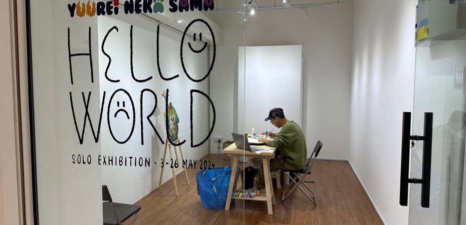 The first time I met Michael Chuah in his modest personal art space was back in June. He was sitting alone at the desk in the middle of the room with a brush in hand and acrylic paints at his side. He was painting a flat piece of wood cut in the silhouette of his latest mascot character, Yuurei Neko Sama. He showcased the character in a solo art show in the same space in May; the promotion was still on one of the glass walls.