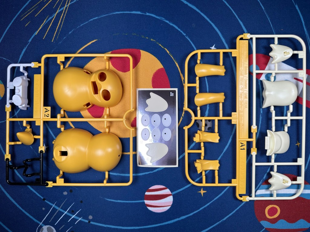 Because the kit is meant for kids and beginners, it only has 13 parts and requires no tools, glue, or paint to assemble and complete. The pieces detach from the sprue with a bit of pressure and can be pushed together, and there is a sticker sheet for details like the feet and eyes.