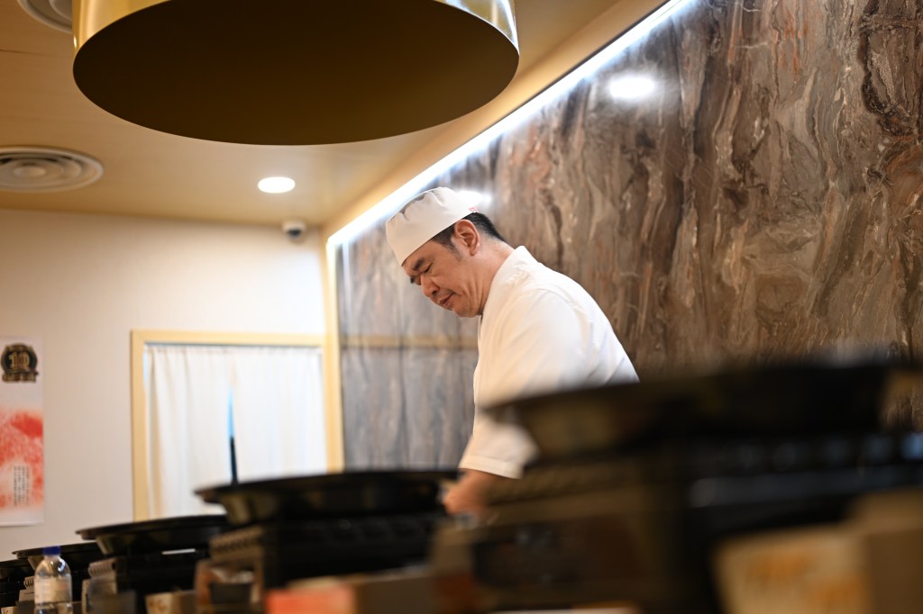 Inside, the restaurant features a long bar. Everyone sits facing where the chefs prepare the beef. As the name implies, the menu featured (halal) wagyu beef and rice. It also served unagi (eel) and udon.