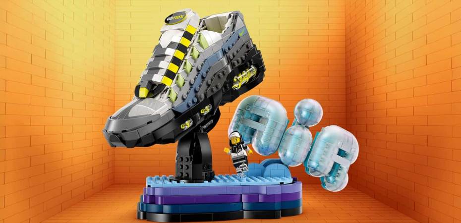 - LEGO Nike Air Max 95 Set (43025): A 1,213-piece model of the sneaker in black, graphite, and neon yellow. The set includes a display stand, a “bubble” logo, a hidden storage drawer in the base, and a minifigure wearing Air Max 95s.