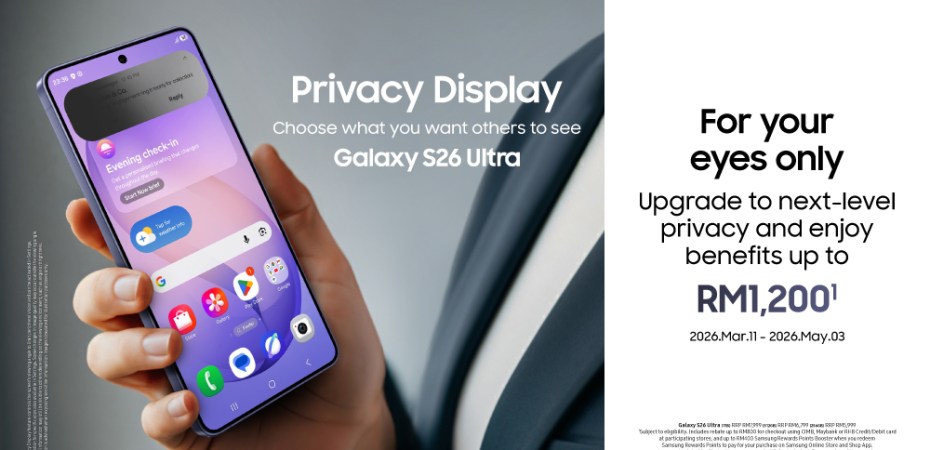 The Galaxy S26 series is available with several purchase incentives through early May. Buyers using specific CIMB, Maybank, or RHB bank cards can receive rebates up to RM800, while Samsung Rewards members can redeem points for an additional RM400 discount.