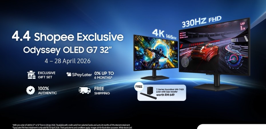 Samsung offers free gifts during pre-order. Buyers of the G80SH 32-inch model at RM5,999 or the 27-inch model at RM5,499 on the Samsung Online Store receive a B450 soundbar worth RM999. The G73SH 32-inch model at RM4,599 on Shopee includes a T420 soundbar worth RM649. Shopee PayLater with 0% interest for 12 months is available on the Samsung e-store.