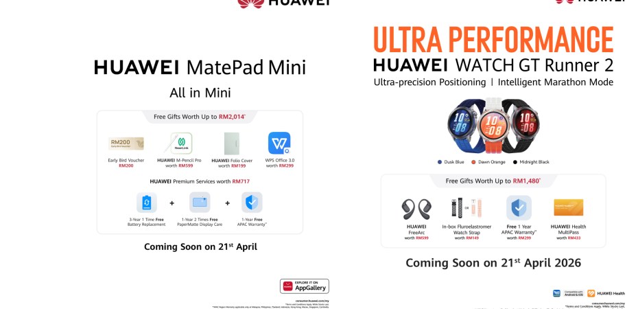 Huawei Malaysia scheduled the launch of the MatePad Mini and Watch GT Runner 2 for April 21.