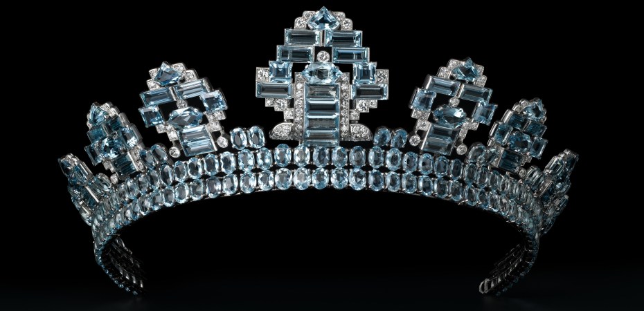 Highlights include the 1902 “Scroll tiara,” the 1907 “Sun tiara” with a 32-carat fancy intense yellow diamond, a 1951 ruby-and-diamond necklace, and the 1949 “Panther sapphire clip brooch” featuring a 152.35-carat cabochon sapphire. The final section showcases over 20 tiaras.