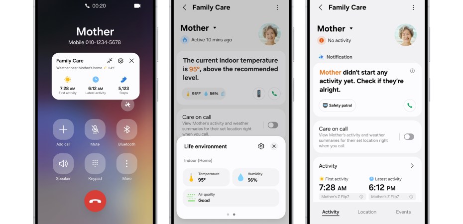 Samsung stated that a feature called “Care on Call” lets a caregiver see key information about a care recipient during a phone call. Before the call began, a floating pop-up showed the time of the first activity of the day, the most recent activity time, and the local weather so the caregiver could ask specific questions.